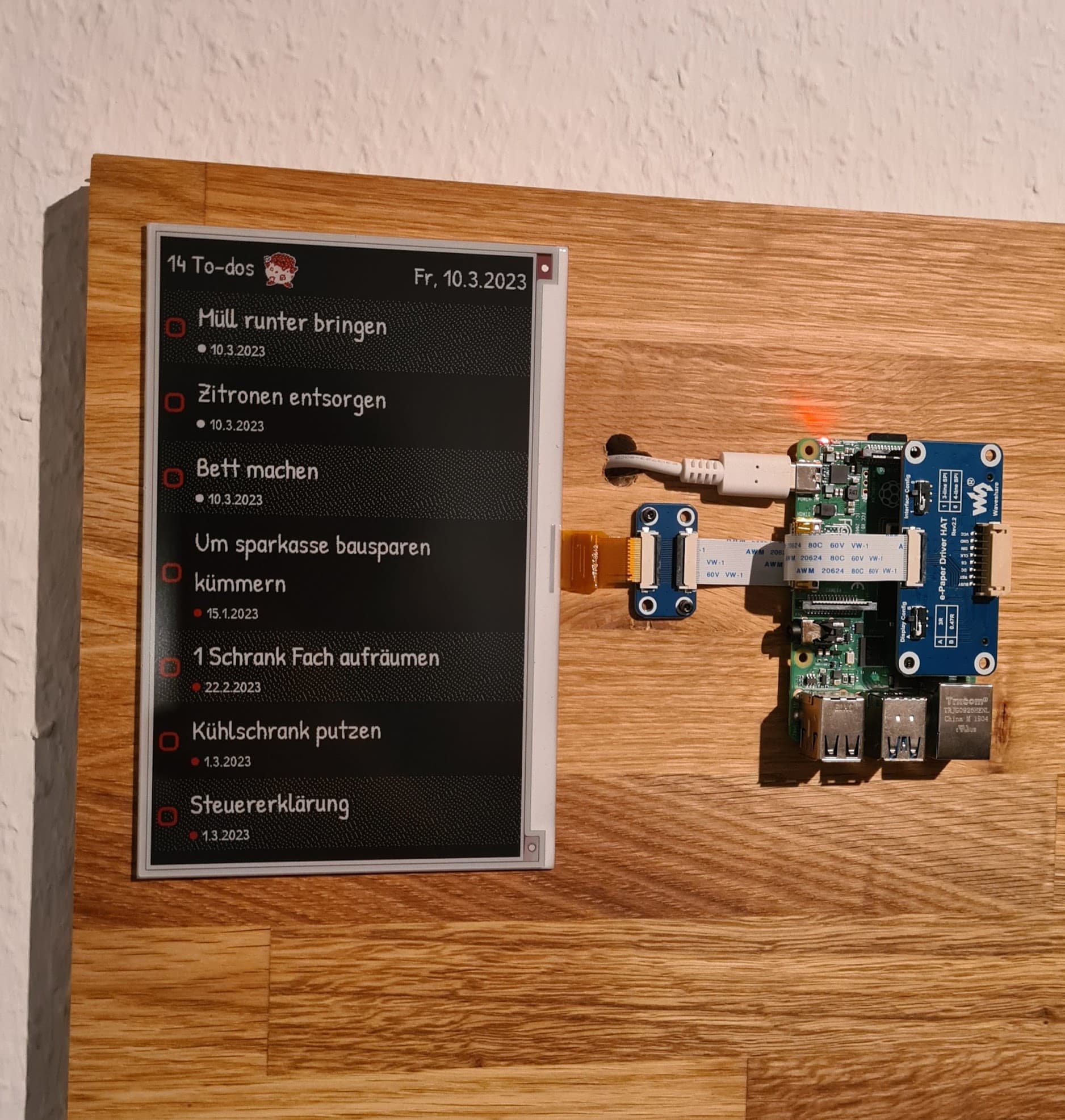 I placed the PI and the display on a larger piece of wood, where I plan to add more e ink status displays in the future (E ink screens just feel so futuristic!). I also added a magnetized pinboard where I can put things like concert tickets and where my friends can leave edgy notes.